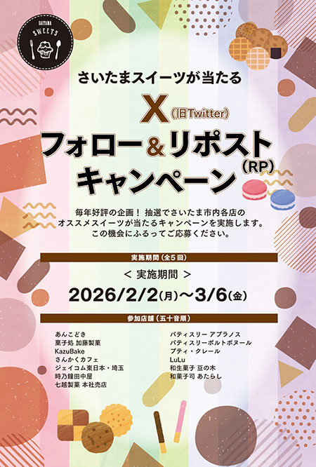 今年はさいたま市誕生20周年。 そこで、抽選で合計20名様に「さいたまスイーツ」が当たるツイッターキャンペーンを実施します。
